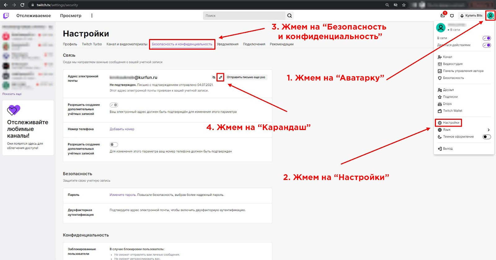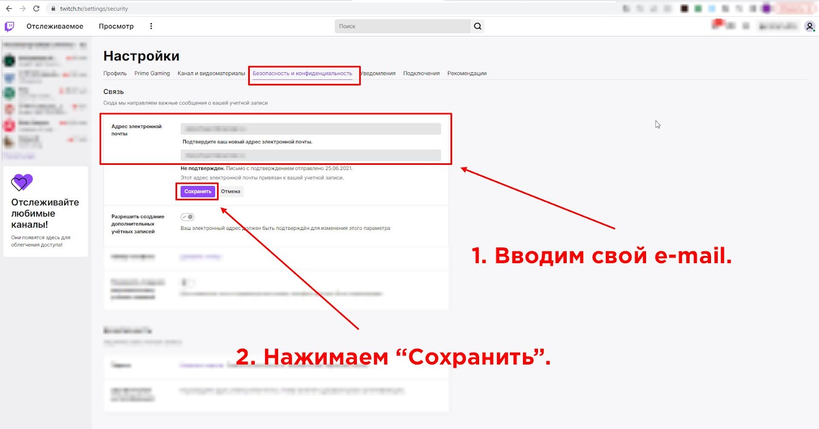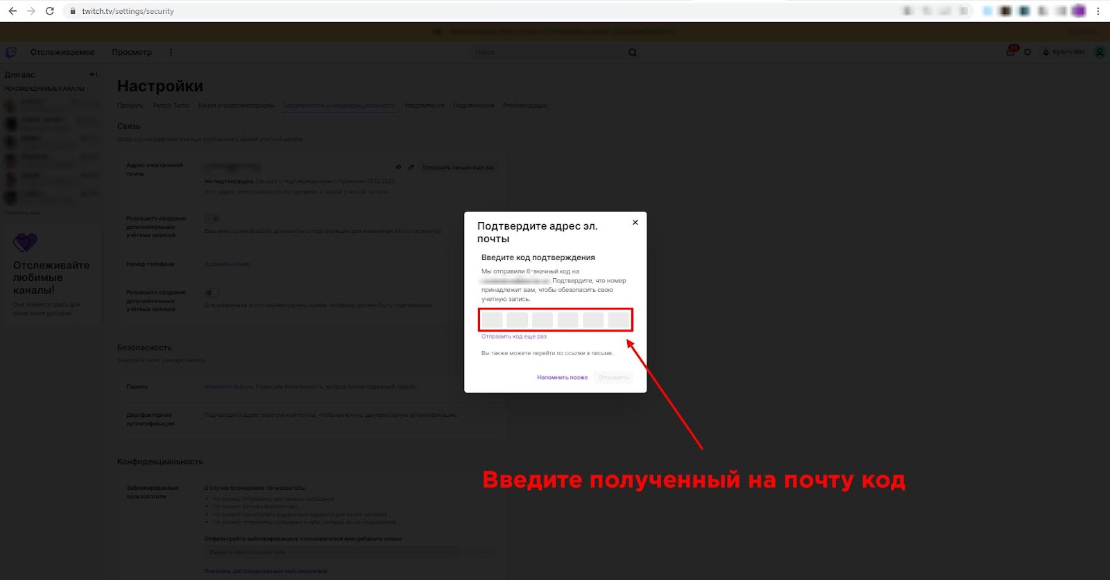 - Зайдите на почту, которую указали на твиче, скопируйте полученный 6-значный код, вставьте его в поле, как показано на картинке ниже.