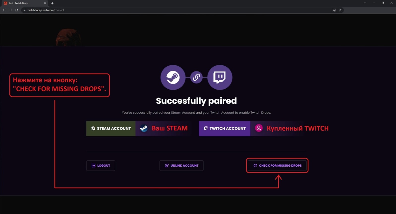 ОЧЕНЬ ВАЖНО! ПОДКЛЮЧАТЬ СНАЧАЛА НУЖНО ВАШ STEAM АККАУНТ, А НЕ КУПЛЕННЫЙ TWITCH АККАУНТ, ИНАЧЕ ВЫ НЕ СМОЖЕТЕ ПОЛУЧИТЬ ПРЕДМЕТЫ