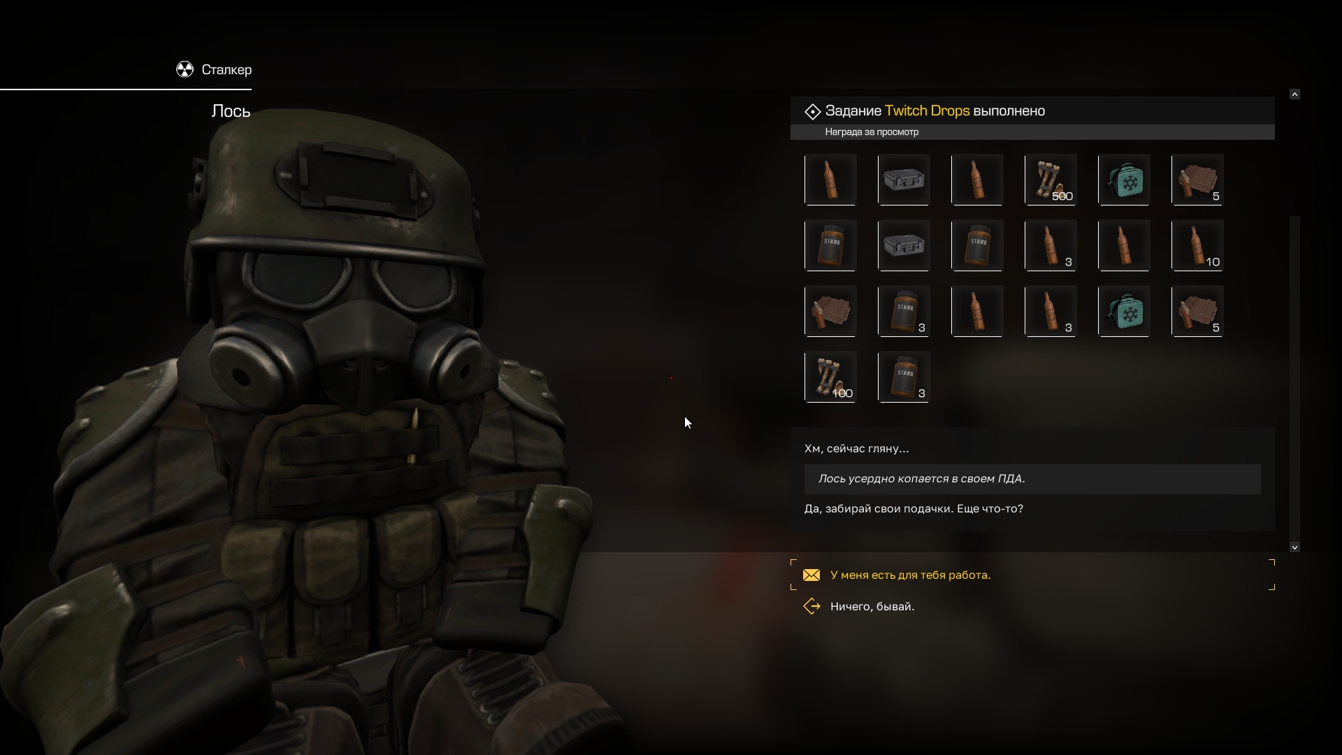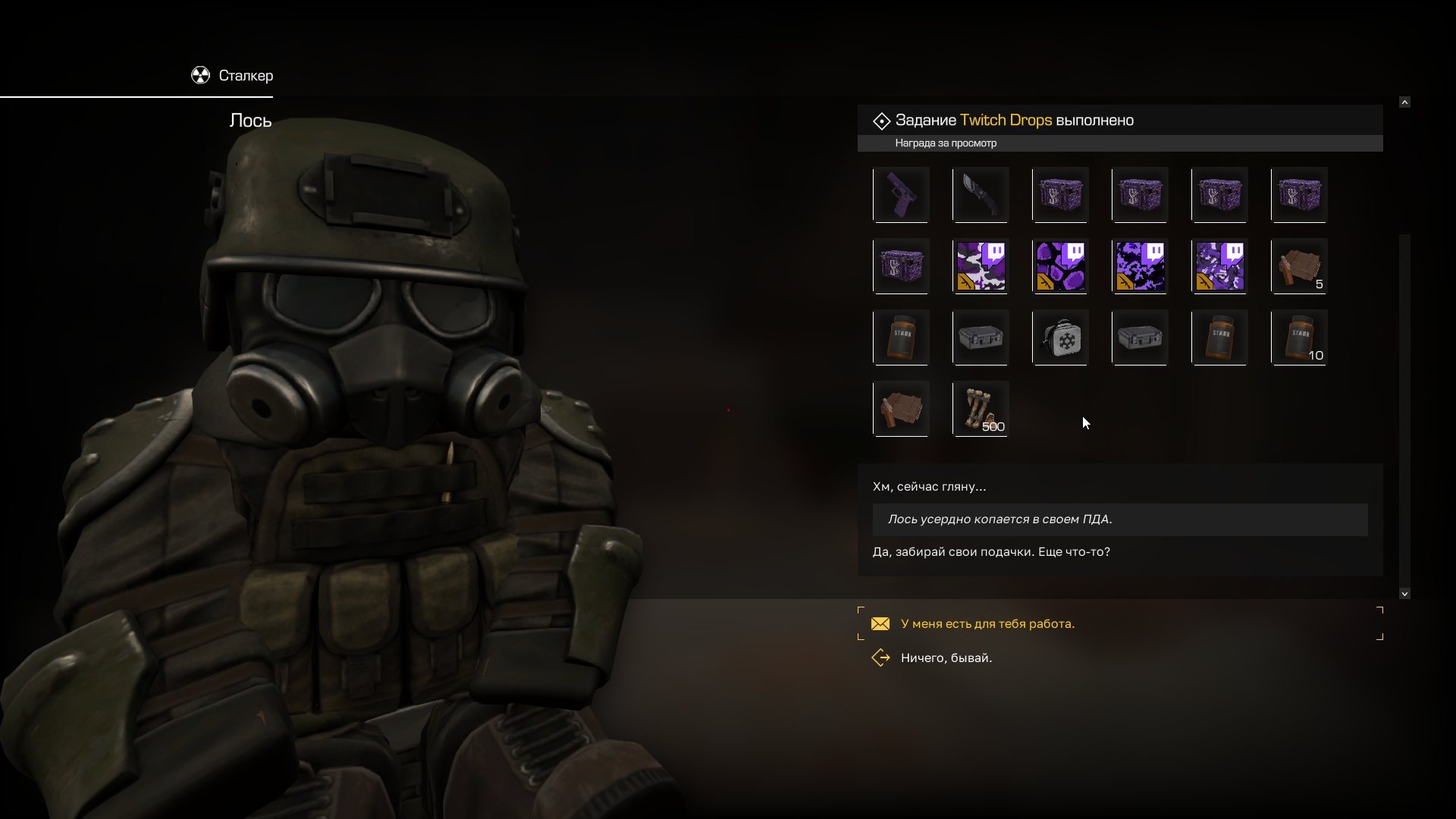 - Если вы еще не пользовались курьером до этого момента, вам необходимо полностью пройти с ним диалог(до инвентаря), закрыть инвентарь, а затем нажать F ещё раз, тогда у вас появится активная фраза с надписью "Twitch Drops", нажав на которую, 20 слотов с предметами сразу попадут к вам в инвентарь.